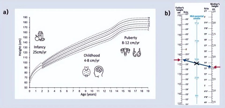 偏离遗传预期:身高明显低于父母遗传身高预期超过3个百分位带[1]。